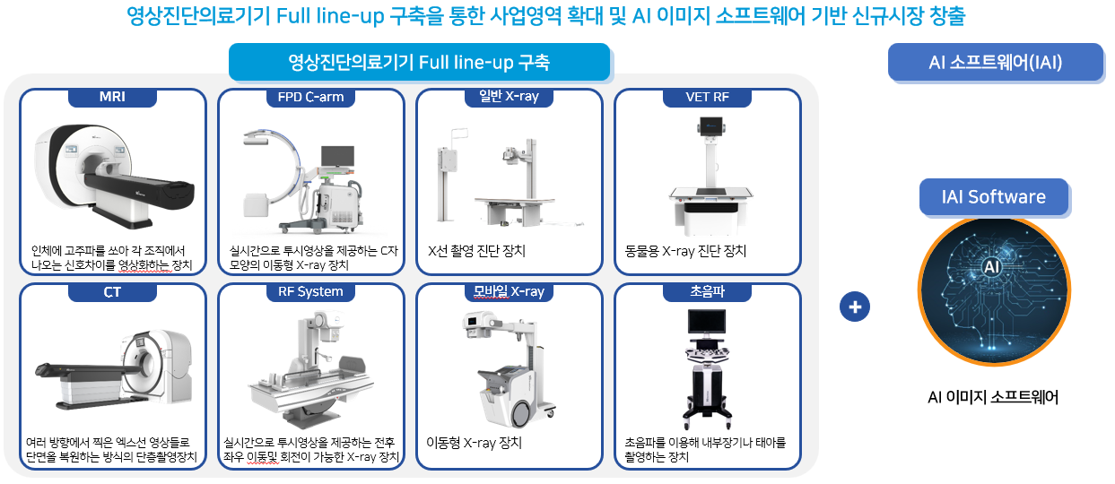 최근에는, 자회사인 민트랩스를 통해서, KAIST와 공동개발한 인공지능(AI) Software “IAI S/W”를 MRI에 적용하여 상용화에 성공하였고, Digital X-ray System부터 CT까지 회사가 보유한 모든 의료영상진단장비에 적용하기 위하여 연구하고 있습니다.