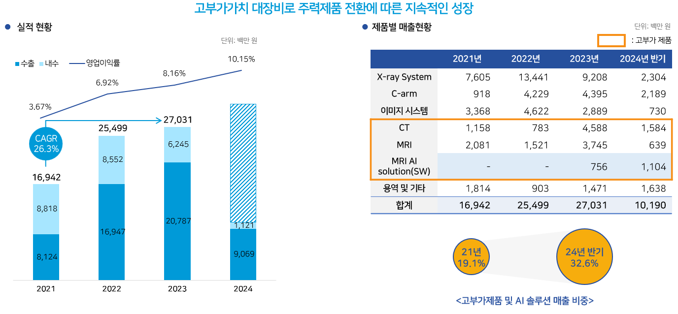 또한, 이러한 성장세는, 인공지능S/W, CT, MRI 등 고부가가치 제품의 성장세에 따른 실적 이어서, 그 의미가 더욱 크다고 할 수 있습니다.